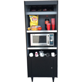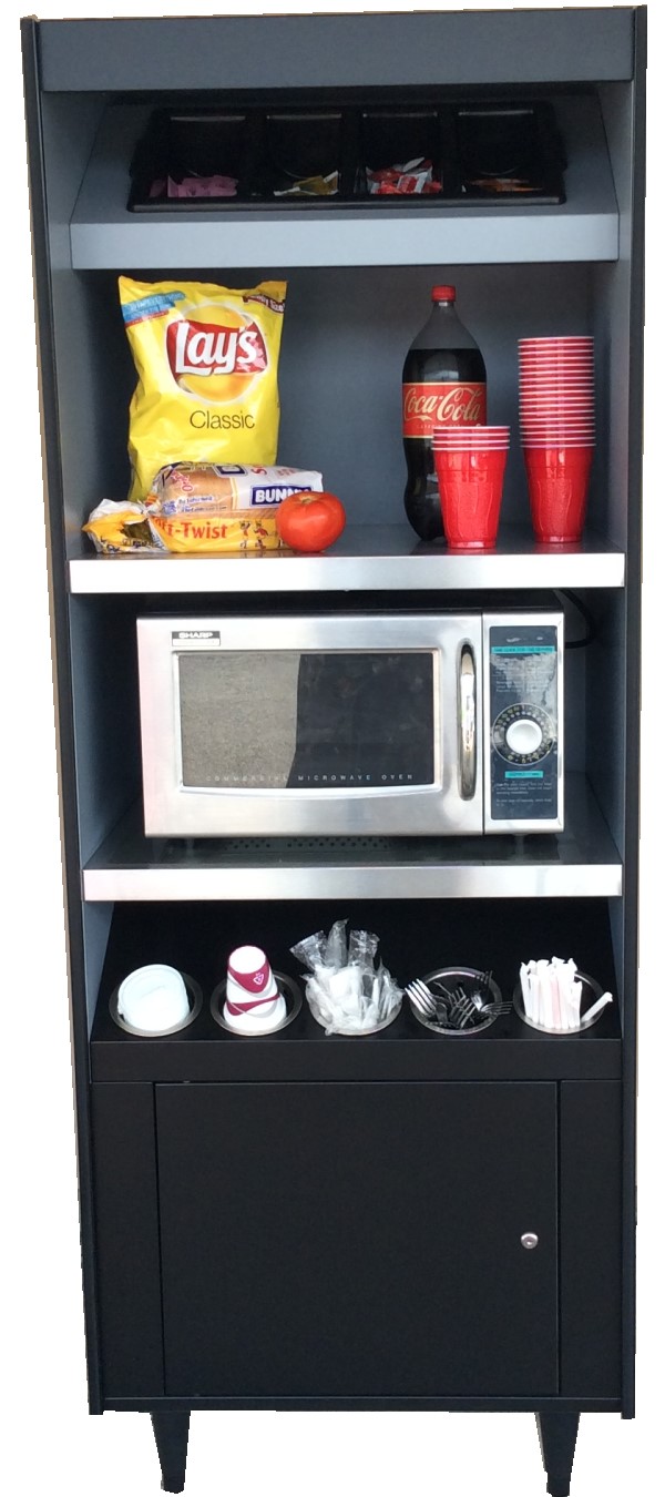 Condiment stand for up to 2 microwaves, with 5 Stainless Steel Cups and 1 Tray with 4 compartments for condiments. Fits snugly between vending machines. Equipped with 20-amp receptacles to accommodate 2 microwaves. No lights.