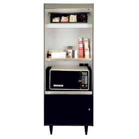 Lighted Condiment stand for up to 2 microwaves, with condiment tray plus storage. Fits snugly between vending machines. Equipped with 20-amp receptacles to accommodate 2 microwaves.
