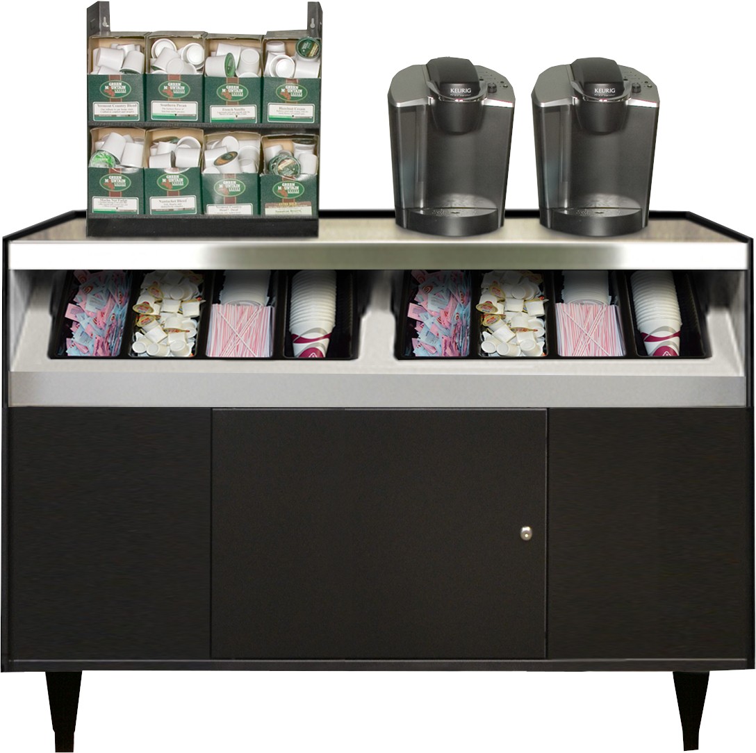 The OCS 490 is our newest office coffee stand, designed to be used with today's single cup units and their merchandisers. This is the widest unit OCS stand in our collection. This new stand also was designed to work well with micro markets. Shown with condiment equipment not included. Stainless Steel top.