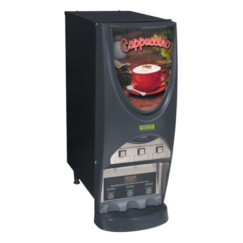 This Bunn iMIX-3S BLK powdered cappuccino dispenser with 3 hoppers from Bunn's Silver Series features a large, lighted display that draws customers' attention to your hot, fresh cappuccino! Its top hinged lift door offers additional space-saving efficiency so that you have extra space for other equipment around the unit. This dispenser features three 8 lb. hoppers that let you serve a variety of different flavors in your convenience store, coffee shop, or cafeteria style restaurant.