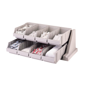 This Cambro 8RS8 Versa self serve condiment bin stand set with 8 bins is a must have, space-saving addition to any coffee shop, convenience store, concession stand, or office break room.