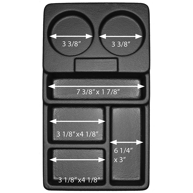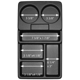 - Compartment sizes: (2) 3 3/8" Diameter, (1) 7 3/8" x 1 7/8", (2) 3 1/8" x 4 1/8", (1) 6.25" x 3"