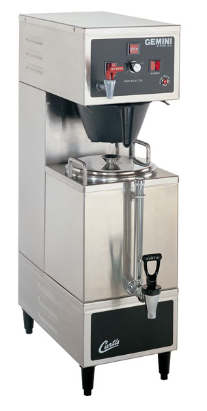 The Gemini System 120A conveniently and automatically brews 12 or 24 cups of rich, full bodied coffee per cycle into a 36-cup insulated Satellite Server. A brew-ready light signals when water temperature is ready for the next brewing cycle. Timer can also be set to brew 24 cups at a time without refilling the brew basket. This full-featured brewer conveniently plugs into a conventional 115V wall outlet.