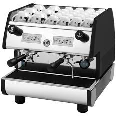 Electronic programmable dosing espresso machine with digital control pad and microprocessor. Four cups size selections including continuous brewing and a stop button. Press-forged nickeled brass groups with vertical infusion chamber and pressurisation system.