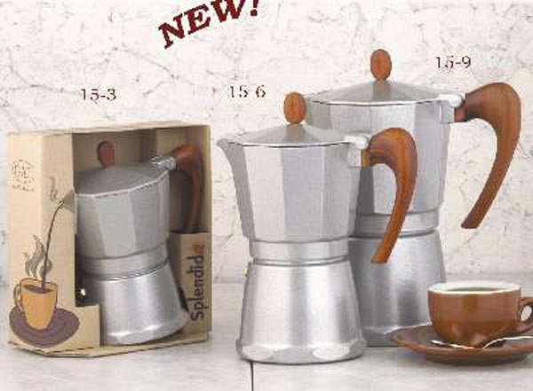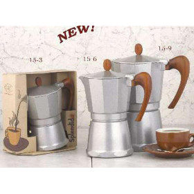 The "SPENDIDA" Stove-top Espresso Maker is made of lacquer smooth heat resistant aluminum. It features a coffee motif top and handle for a great looking espresso service that will impress your guests with its style and delicious espresso. This espresso maker produces up to 9 cups of espresso. Stands 10" high. This stovetop espresso maker is made in Italy and is shipped in a gift box. At this time only the large 9-cup option is available.