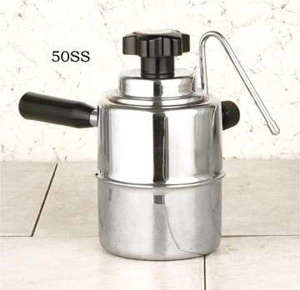 This stainless steel stove-top steamer is perfect for frothing cappuccino, latte or chai tea. Made of heavy 18/10 stainless steel, it also has a bakelite handle and knob. Perfect for camping. 8" high. Made in Taiwan under the highest quality control.