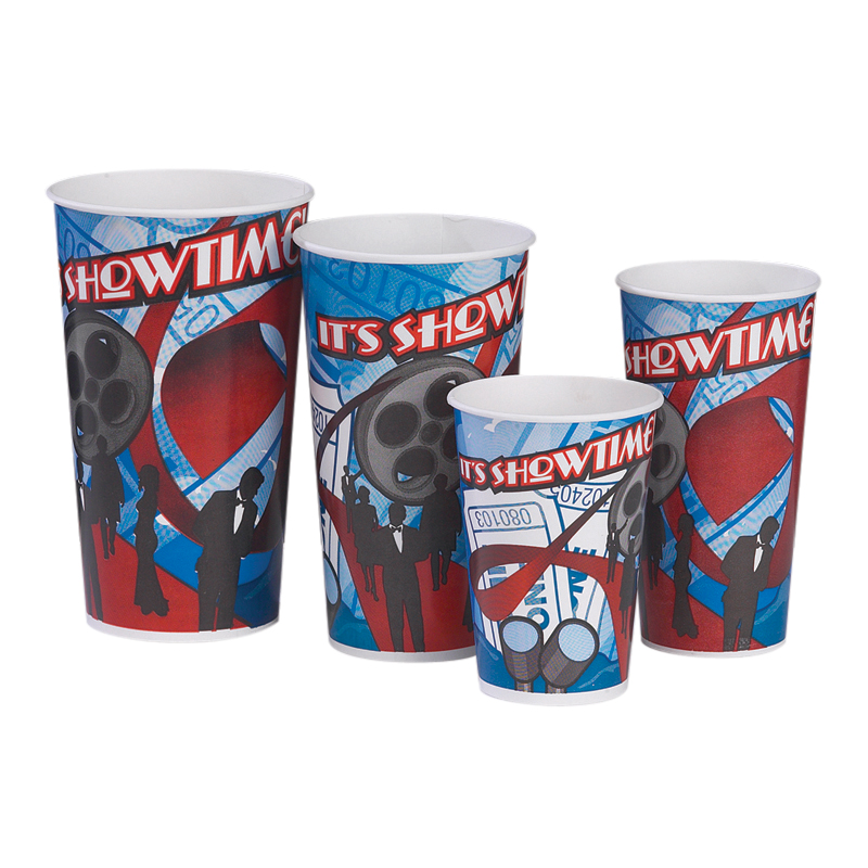 It's Showtime Movie Theater Drink Cups! Drink Cups are 22oz poly coated paper. Perfect for that Movie Night Party or Home Theater use! These are authentic movie theater beverage cups and are perfect for your Home Theater! Keep these on hand for movie night! Watch for smiles from your guests with these authentic movie theater drink cups! Cups are 22oz and are 2.5" diameter at the bottom, 3.5" diameter at the top and 6.25" tall. Ideal for a 12-16oz soda with ice. Everything you need for home theater beverage serving.