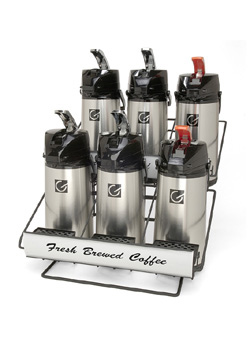 This 6 Airpot Rack is great for serving coffee at any business or social event. It includes (6) 2.2 Liter lever top airpots, and can be combined with other racks to make larger setups for a bigger selection of coffee.
