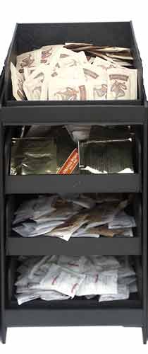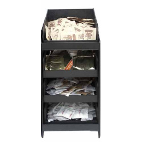 Black condiment tray with four separate areas for sugar, cream, half and half, etc. Makes all the items that customers love in their coffee easily accessible.