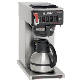 The Bunn CWTF-TC DV automatic thermal carafe coffee brewer can brew up to 7.5 gallons of coffee per hour directly into thermal carafes. Lined with glass or stainless steel, thermal carafes can keep your coffee hot and fresh for hours at self service stations or servers areas without the use of a warmer!
